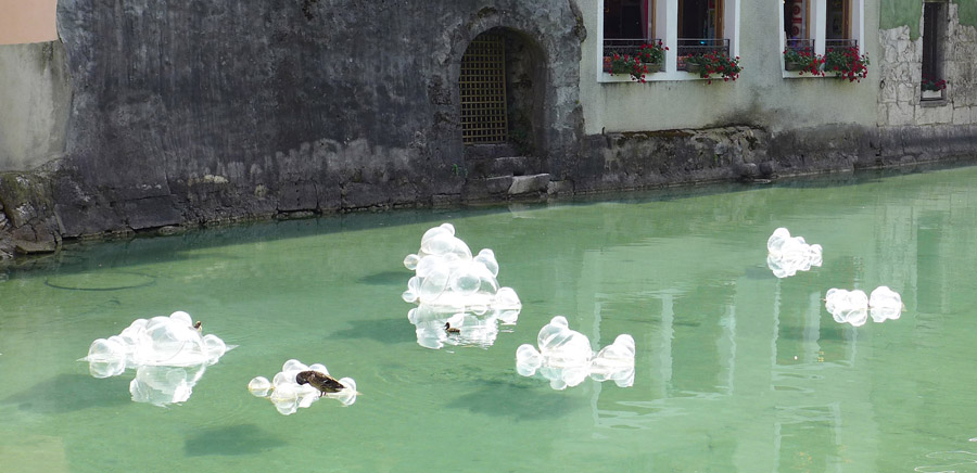 Une émulsion de bulles où dort un nuage liquide prêt à s'éveiller glisse doucement sur l'eau du lac. Les bulles assemblées constituent une enveloppe protectrice pour quelques gouttes d'eau. Tout au long de la journée, cette création nébuleuse évolue au gré de son vent intérieur. Elle est dynamique et imprévisible car elle réagit à des influences climatiques : différences de température, rayons du soleil. A l'origine transparente, les bulles s'opacifient avec la condensation et nous apparaissent iridescentes voire opalescentes en fonction de la luminosité, de l'heure et du point de vue. Fabriquer un moule-à-eau : rendre visible de micro-métamorphoses climatiques Le nuage est une matière impalpable, à l'allure immatérielle, et révélatrice d'un état climatique. Il est juste entre trois états de matière: gazeux (évaporé); solide (matérialité illusoire); et liquide. Métamorphose subtile infinie et indéfinie, il est le manifeste vivant du climat. Cette matière molle n'est jamais accomplie mais toujours en accomplissement. Dans cette installation, le nuage évolue en permanence à l'intérieur d'une enveloppe protectrice en forme de bulles. Ce moule-à-eau est composé de demi-sphères en plexiglas fermées contenant une petite quantité d'eau. En fonction de la température, celle-ci se transforme en vapeur qui se dépose sur les parois transparentes des bulles de plexiglas. Le nuage est alors « moulé » grâce à la condensation qui lui donne une constitution diaphane.